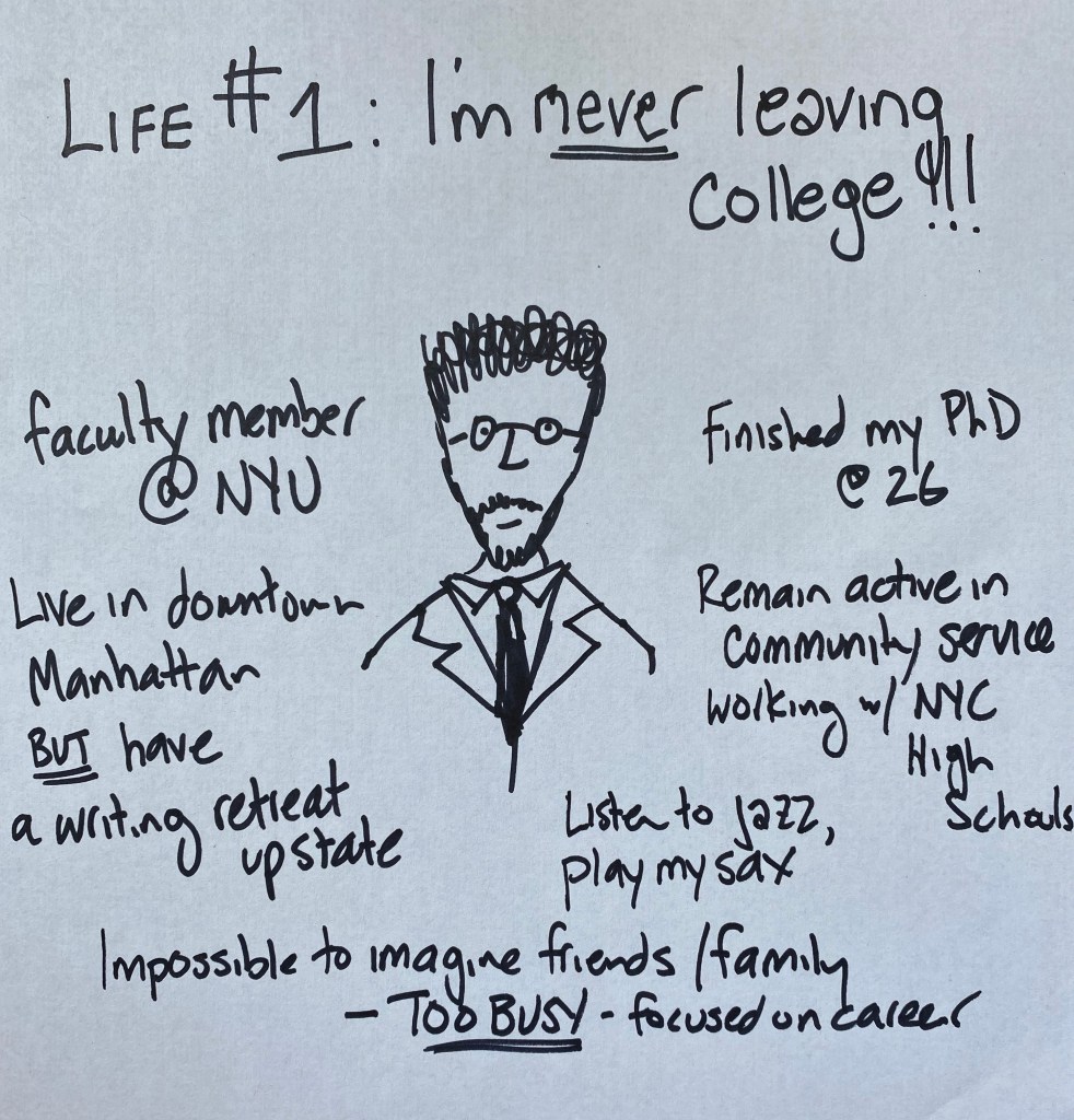 A central premise of Life Design is that each of us have multiple possible futures – that in some alternate dimension there is a version of me pursuing a life as an attorney in New York, a high school teacher in Oakland, and a coffee shop owner in the Hudson Valley. Rather than ignore these possible “future versions of us” in favor of the story we currently tell, Life Design encourages us to explore these future selves for inspiration and insights.
