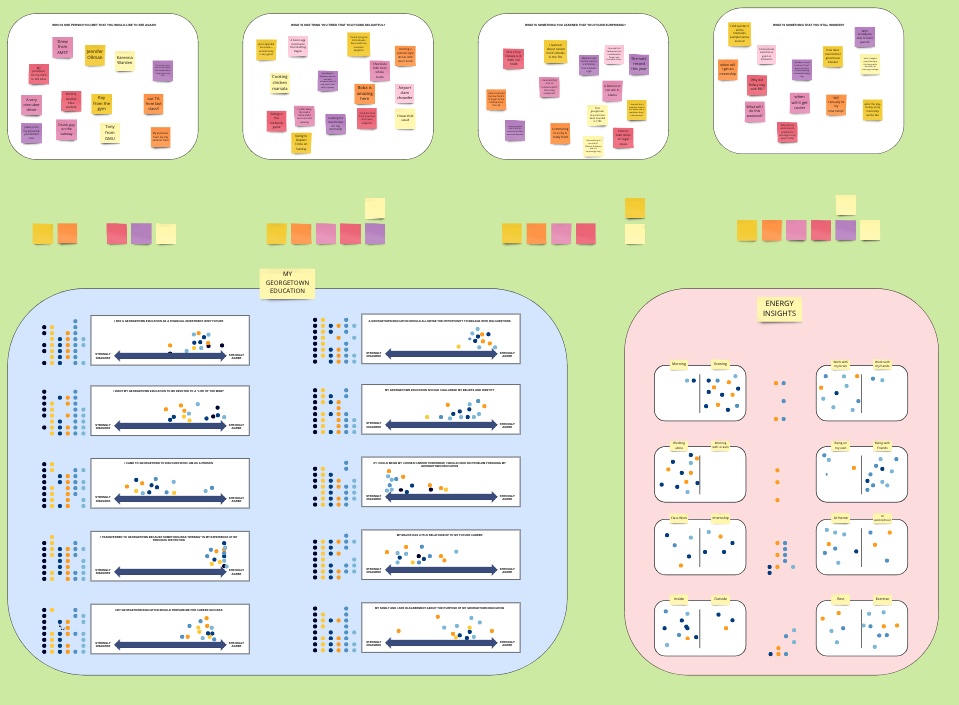 I recently wrapped up teaching Designing Your Georgetown, a course I have taught for the past three semesters to incoming transfer students at Georgetown’s Capitol Applied Learning Labs (CALL). The CALL allows me a lot of freedom in how I structure and teach the course, and each semester I take the opportunity to try out new approaches to better serve my students: new transfers to Georgetown who are spending their first semester living in downtown DC, interning at local agencies, and taking advantages of the CALL’s unique curriculum. This semester I decided to use Miro as the primary tool both for in-class activities and for individual student portfolios. For those not familiar with the platform, Miro is an online visual collaboration tool that make it easy for remote teams to move through a design process. I’ve used Miro previously in both staff meetings and for virtual courses, but this was the first time using it in a traditional in-person course. Here is what I think are the pros and cons.
