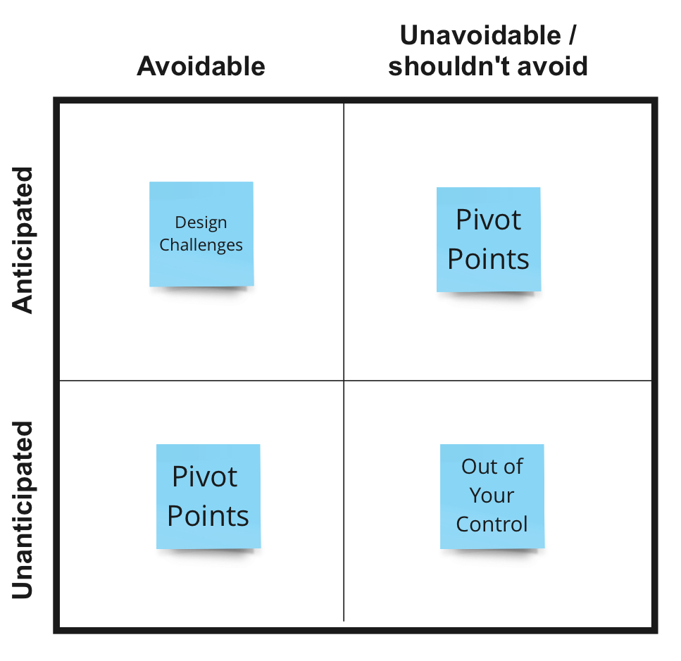 - PIVOT POINTS – this bucket would include two distinct types of possibilities. One is those points of failure that can be anticipated but can’t necessarily be avoided, or can only be avoided with the benefit of hindsight. An aspiring investment banker knows that a recession that impacts hiring in the financial sector is a distinct possibility, but has little control over the global economy and lacks the ability to time the job market. The second type of possibility is one that can be anticipated but that shouldn’t be avoided because it allows for possibility or insight. A pre-med student realizing during a clinical volunteer experience that she doesn’t like working with patients is gaining valuable insight into her career. Both possibilities will require the student to pivot from their original design.