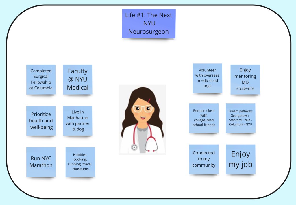 After sketching out Life #1 (see above for an example), ask students to imagine that they “failed” to achieve this life and invite them to spend 10 minutes working individually or in small groups to ideate all of the possible reasons why the group members lives didn’t work out as planned. As with any ideation activity, the goal is to get past the tendency to self-censor in order to generate as many ideas – including wild, random, or implausible ideas – as possible. At the end of this activity, each student should have at least a couple dozen ideas for how their life might not end up like they imagine, ranging from the obvious (failing organic chemistry, discovering they don’t like working with patients) to the serious (struggles with mental health, having to leave school due to financial issues) to the fantastical (all medical schools shut down at once, aliens invade Earth and all college-aged students are drafted into a global army to wage a space war). Again, the goal isn’t to generate a list of the most likely reasons their life won’t turn out as planned, so encourage students to avoid throwing out any ideas for being “too far fetched.” After all, how many of us could have predicted three years ago that a global pandemic would shut down most of the world’s economy and completely rearrange how and where we work?