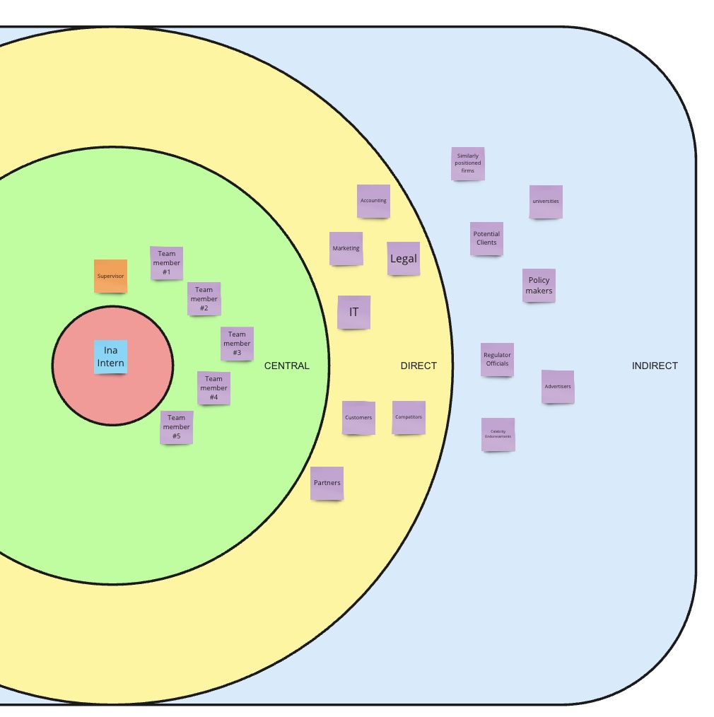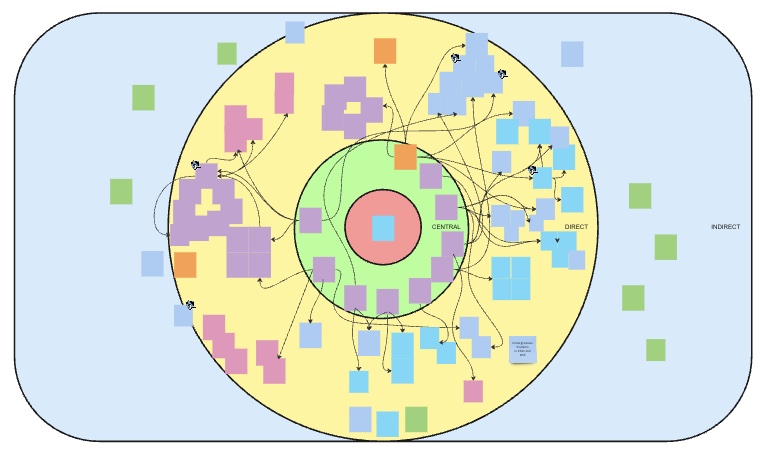 For this step, give yourself 10 minutes to list as many stakeholders (individuals, groups, and organizations) that you can think of in each of three groups a – Core, Direct, and Indirect – and add them to their respective areas on your map: