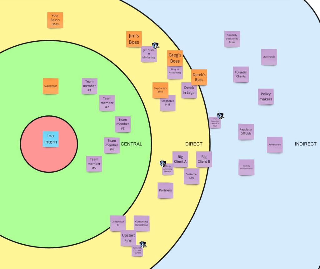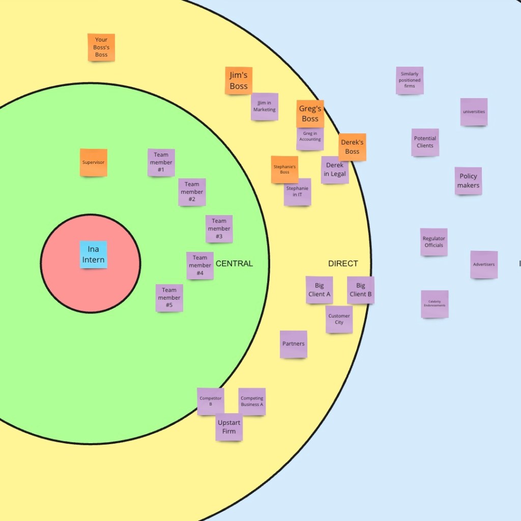 To help organize the process of building out these networks during a summer internship or other experience, I have my students create a stakeholder map. Stakeholder maps are a design thinking tool that helps designers who might have an interest (i.e. a “stake”) in the process. In Life Design, the purpose of this stakeholder map is multifaceted. It can help you: